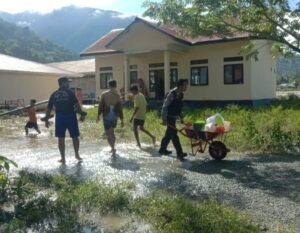 Tribrata/Polsekbiromarunews – Anggota Polsubsektor Gumbasa, Polsek Biromaru Polres Sigi, yang dipimpin langsung oleh Kapolsek Biromaru  Akp Abdul Azis S.H dan Kasubsektor gumbasa Ipda Sungeng Prianto S.H, turun langsung ke lokasi banjir untuk membantu masyarakat dan mengevakuasi barang-barang berharga milik korban banjir di desa setempat.